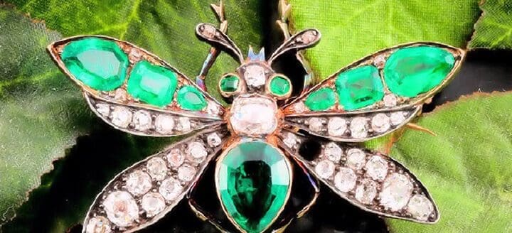 We are drawn to wear insect jewellery for its symbolism and meaning, but that is not the whole story. The other side of the equation is how well the subject matter lends itself to interpretation in so many of the media associated with jewellery making; from fine pavé set pieces with emeralds, diamonds, rubies and sapphires, to enamel work, glass, carved stones and pearls. The interpretations are almost limitless, as is the appetite for this jewellery. Although not every interpretation is easy to stomach. Now considered in questionable taste we have also used the body parts of insects themselves as part of the jewels, including butterfly wings and scarab shells. Even this, however, is not as distasteful as the practice of late 19th century Britain, and still current in some parts of South America, of wearing live insects, sometimes caged and occasionally even with jewel encrusted shells.
