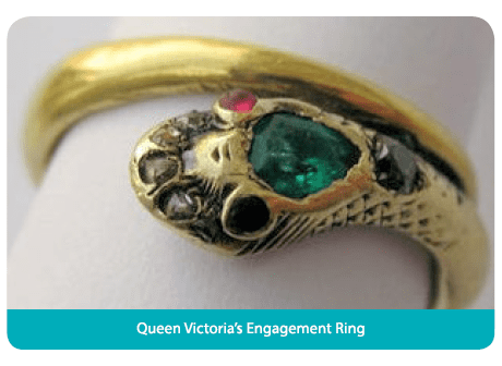 These events provoked a huge wave of popularity in all things Egyptian; including an interest in snakes which became hugely commercial in the Victorian period. This trend was undoubtedly encouraged by the engagement ring presented to Queen Victoria by Prince Albert in the earlier part of the century. The ring, in the form of a coiled snake, symbolised eternal love with its endless coil. Victoria’s ring was set with an emerald to the head, this being Victora’s birthstone. Known as an ouroboros, the emblematic snake or serpent with its tail in its mouth represents eternity and rebirth. It is a motif which occurs frequently in jewellery, not only in rings but also necklaces and often suspending a heart locket.