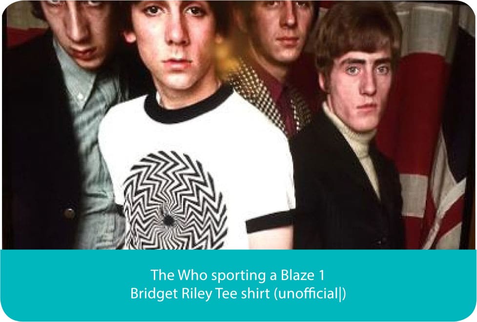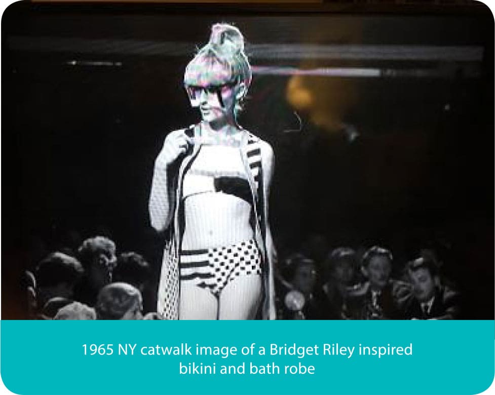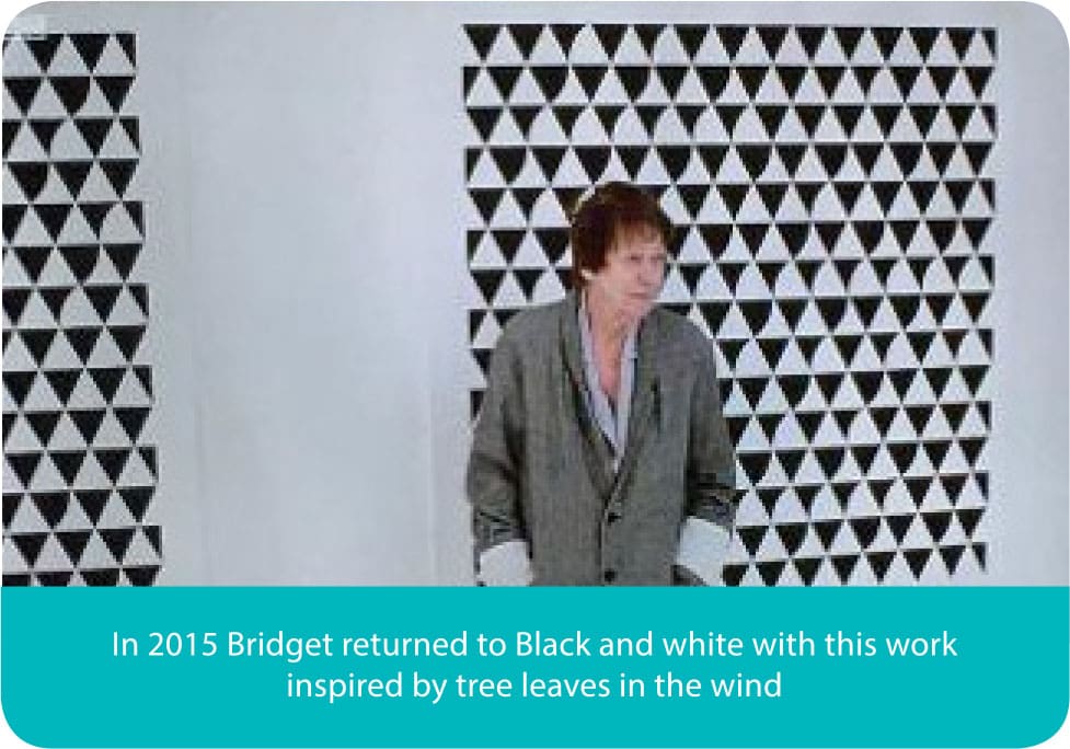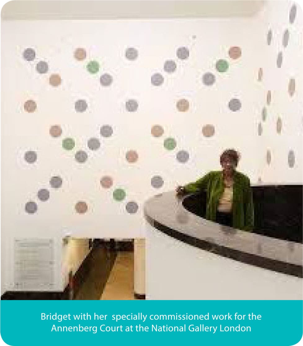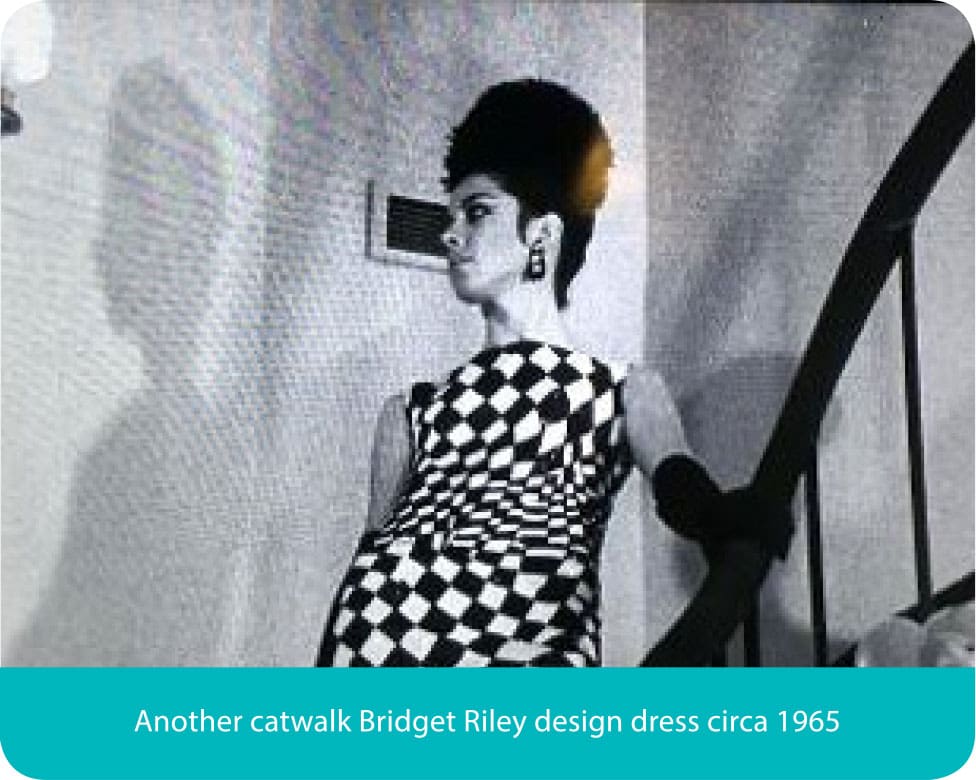 It was a blockbuster exhibition of mixed International Contemporary Artists at the Museum of Modern Art in New York in 1965 that sealed Bridget’s reputation as a major international artist. The exhibition took NY by storm, welcome as this was Bridget was totally taken by surprise and made uncomfortable by seeing how fast her art flowed out from MOMA onto the streets of NY. Within days of the opening her images had been siphoned off onto dresses, skirts T-shirts and fabrics of all sorts which defined the era for the rest of the 60’s.