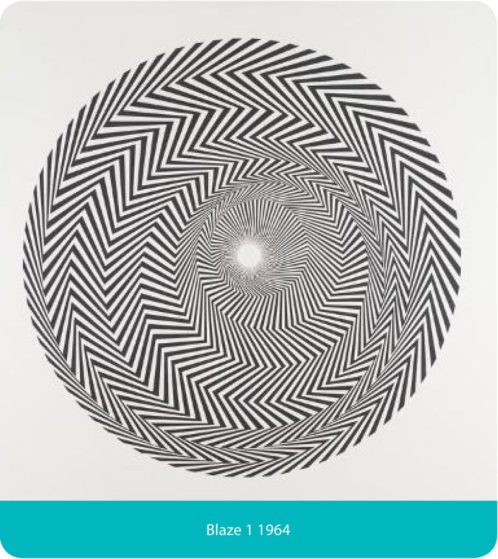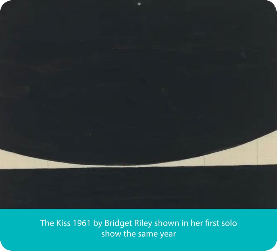 Bridget Riley was inspired to create work that looked like nothing anyone had ever seen before, she not only broke the mould she literally blew it up! ‘The Kiss’ appears as one of her earliest groundbreaking images in 1961, in her first show in London when she really hit her stride and she had finally broken away from all the 19th Century conventions she had been taught about constructing a work of art.