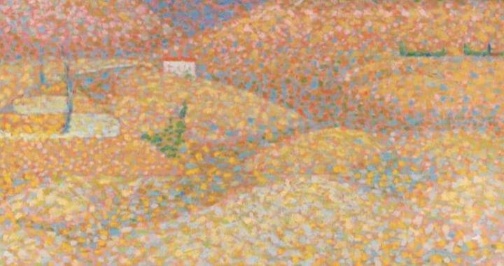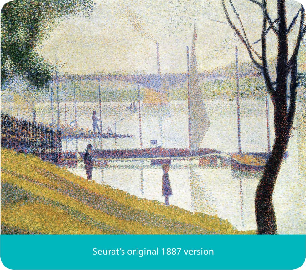 After the war Bridget began her studies in London and was classically trained at Goldsmiths College then followed by the Royal College of Art for some more classical training, all focusing on painting, drawing and sculpture. Her class mates included Peter Blake, Frank Auerbach and John Bratby. Her student work while at the Royal College is very much what was expected of you in the 1950s, sombre and faintly French narrative paintings nothing at all like you associate with Bridget’s work now. Bridget left the RCA in 1955 and intent on being a painter she set out to find her style, she found the work of Georges Seurat resonated and strongly influenced her then and for the rest of her life. She saw in his work something similar to what she was looking for, something new and different. For a while during 1959, she experimented by both adopting his style and by faithfully copying one of his pictures called