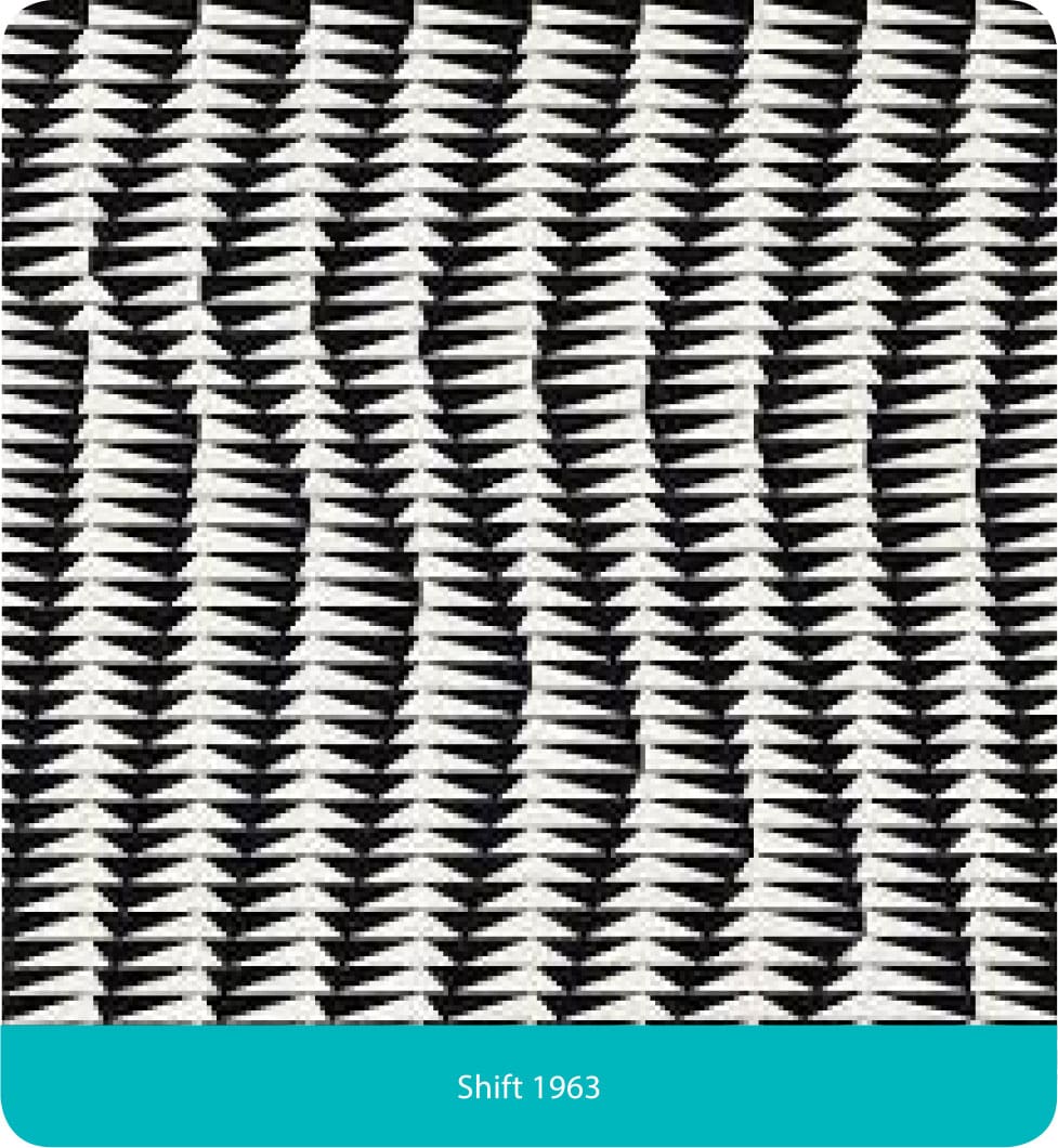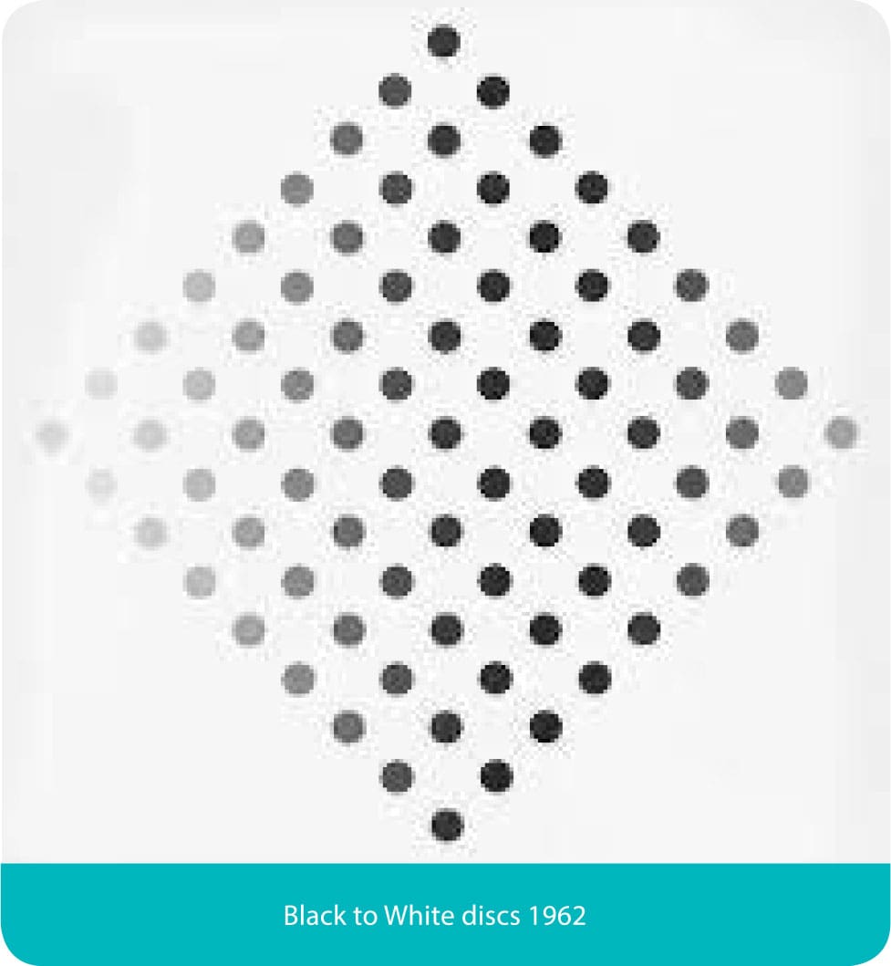 We use ‘Abstract’ to describe Bridget’s work, but for me and many others including Bridget it’s not the right or appropriate word, it’s something else that draws from nature and shows nature. In these early years all of her work is black and white, what changes are the shapes, forms and movement variations. By 1962 discs appears with the movement expressed by the fading of the discs from left to right strong towards the centre and then fading out towards the sides this picture marks the beginning of experimentation between what the artist sees and what the viewer experiences, experimenting all the time with what it feels like to look at a work.