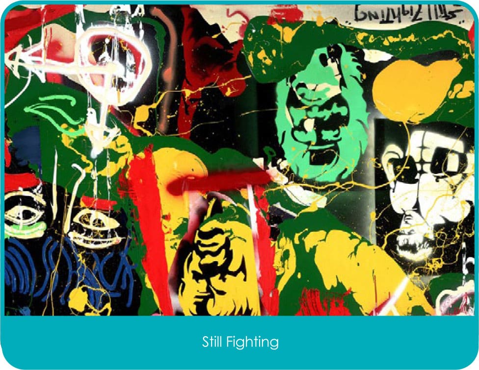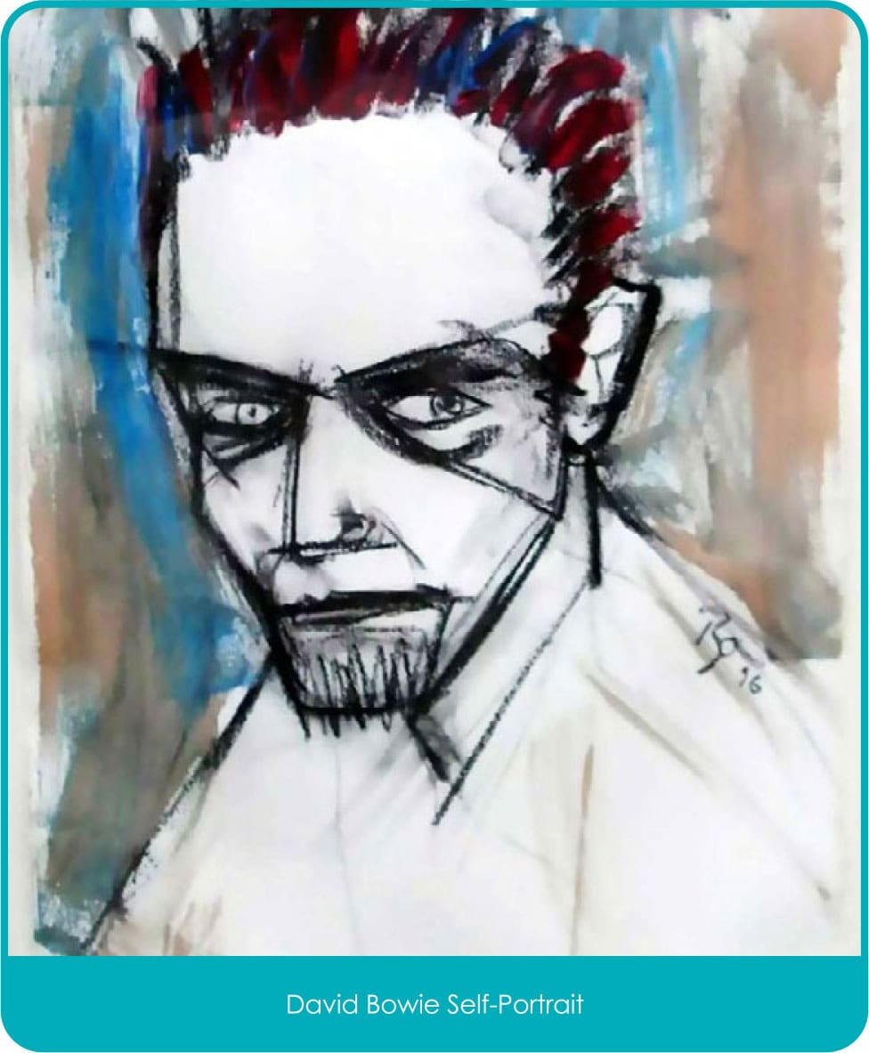 Varying his medium depending on the mood he wishes to evoke, Ronnie creates his original pieces in charcoals, oils, watercolours, spray paints, oil pastels and acrylics. His subjects range from band members and musicians he admires to close friends and self-portraits.