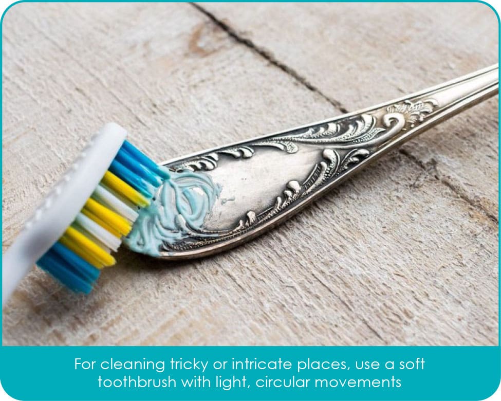 Caring for your silver starts with understanding a little about the properties of silver. Sterling silver is 92.5% silver and therefore only 7.5% alloy. Compare this with 9 carat gold which is 37.5% gold and 72.5% alloy, or even 18 carat gold which is 75% gold. Silver, therefore, which is not an inherently hard metal, is extremely vulnerable to scratching. According to the Mohs scale which measures the hardness of materials; in order of softness, you have sterling silver, 9 carat gold, 18 carat gold, platinum and palladium. Rule number one is therefore to avoid cleaning with anything even slightly abrasive. I prefer pastes and foams which you apply with warm water.