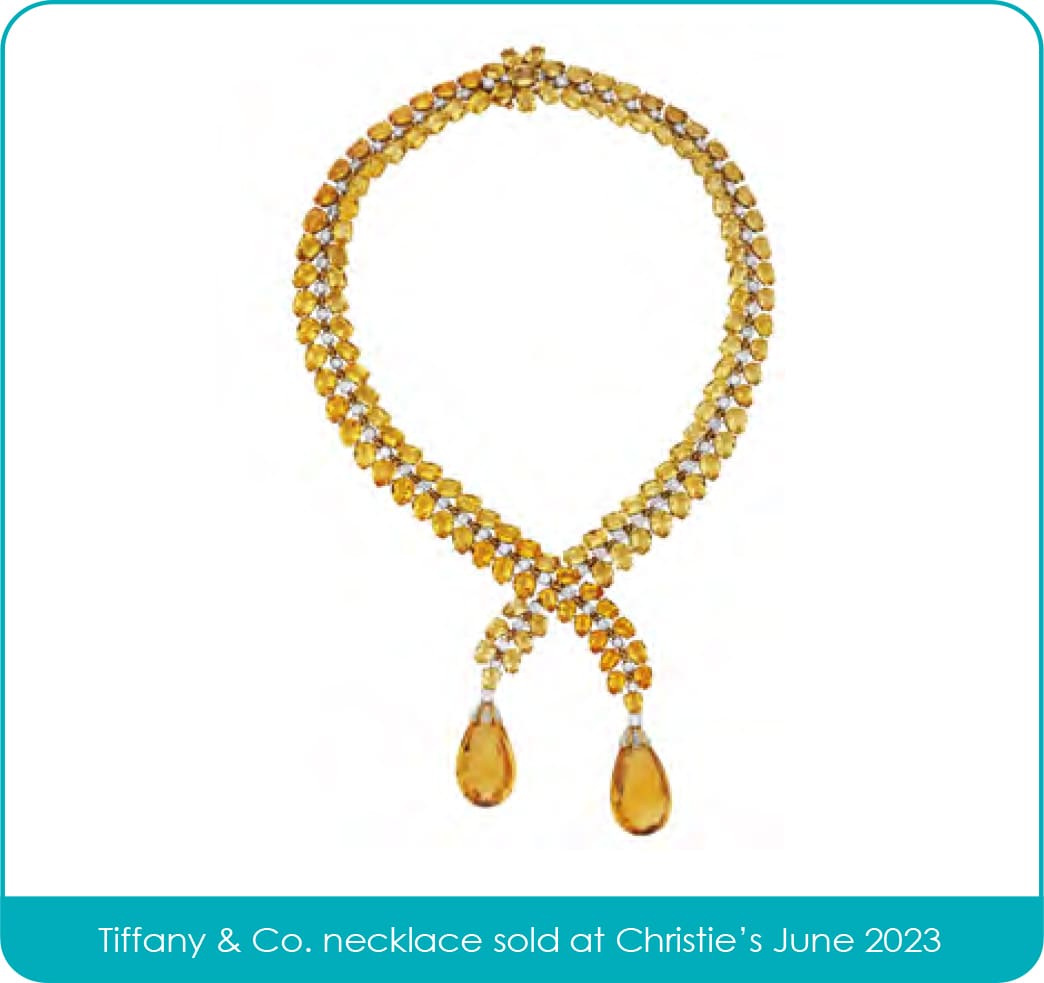 She dazzled the crowds with a 1962 gold and platinum Tiffany & Co. necklace. It is set throughout with oval, pear and briolette-cut yellow beryls and brilliant-cut diamonds. A similar piece, dating from 1967, sold in June last year, 2023, at Christie’s for USD $189,000, set with approximately 86 brilliant-cut diamonds, weighing 7.00 carats.