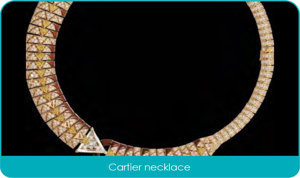 She wore a spectacular gold and petrified wood necklace of reptile inspiration. Composed of 57 links, each set with white and yellow diamonds.