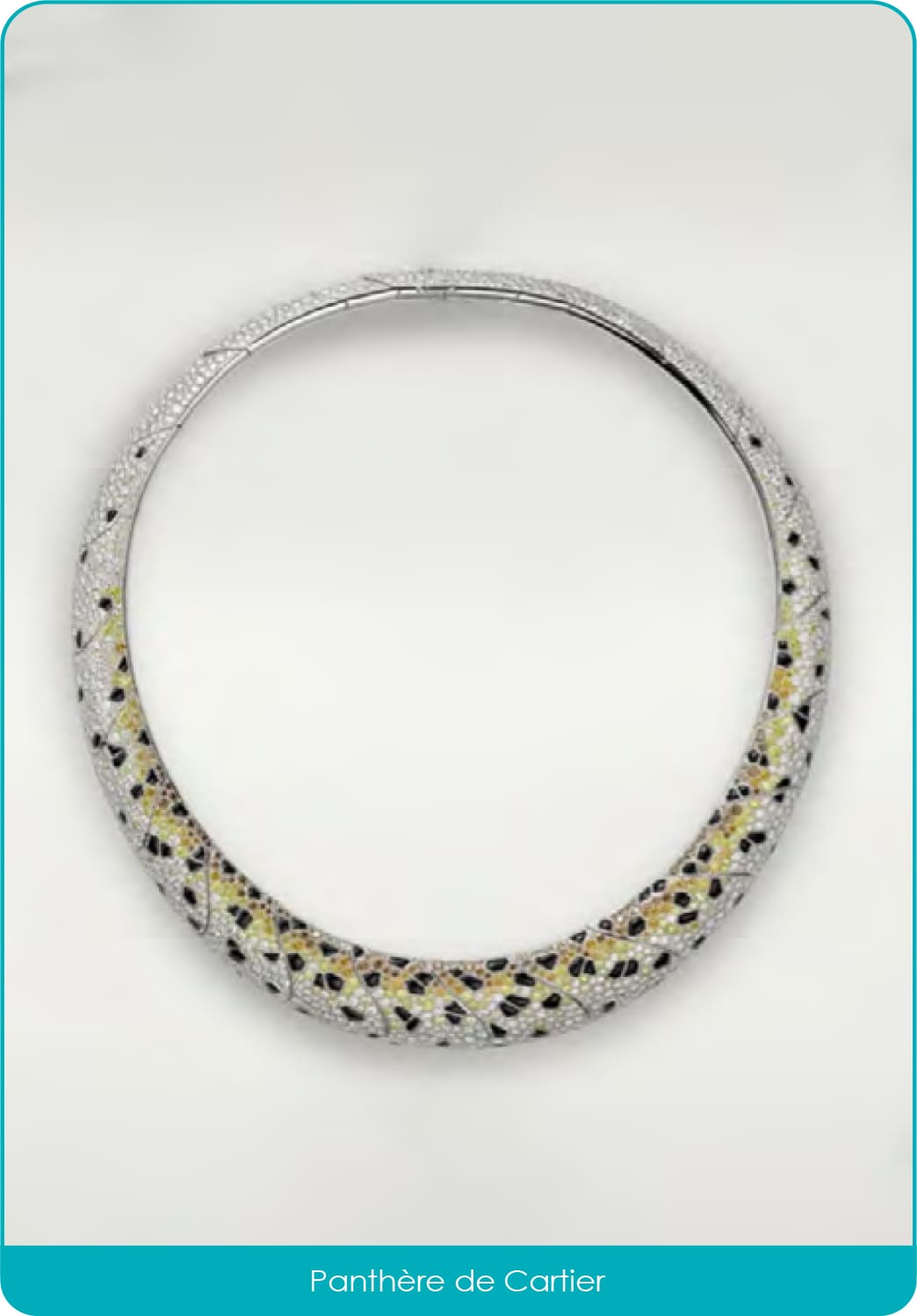 Echoing that style of individual panels is the Panthère de Cartier necklace set with almost 2,000 white, orange, yellow and brown diamonds, totalling just under 40 carats. A truly unique piece and a statement to Cartier’s savoir-faire.