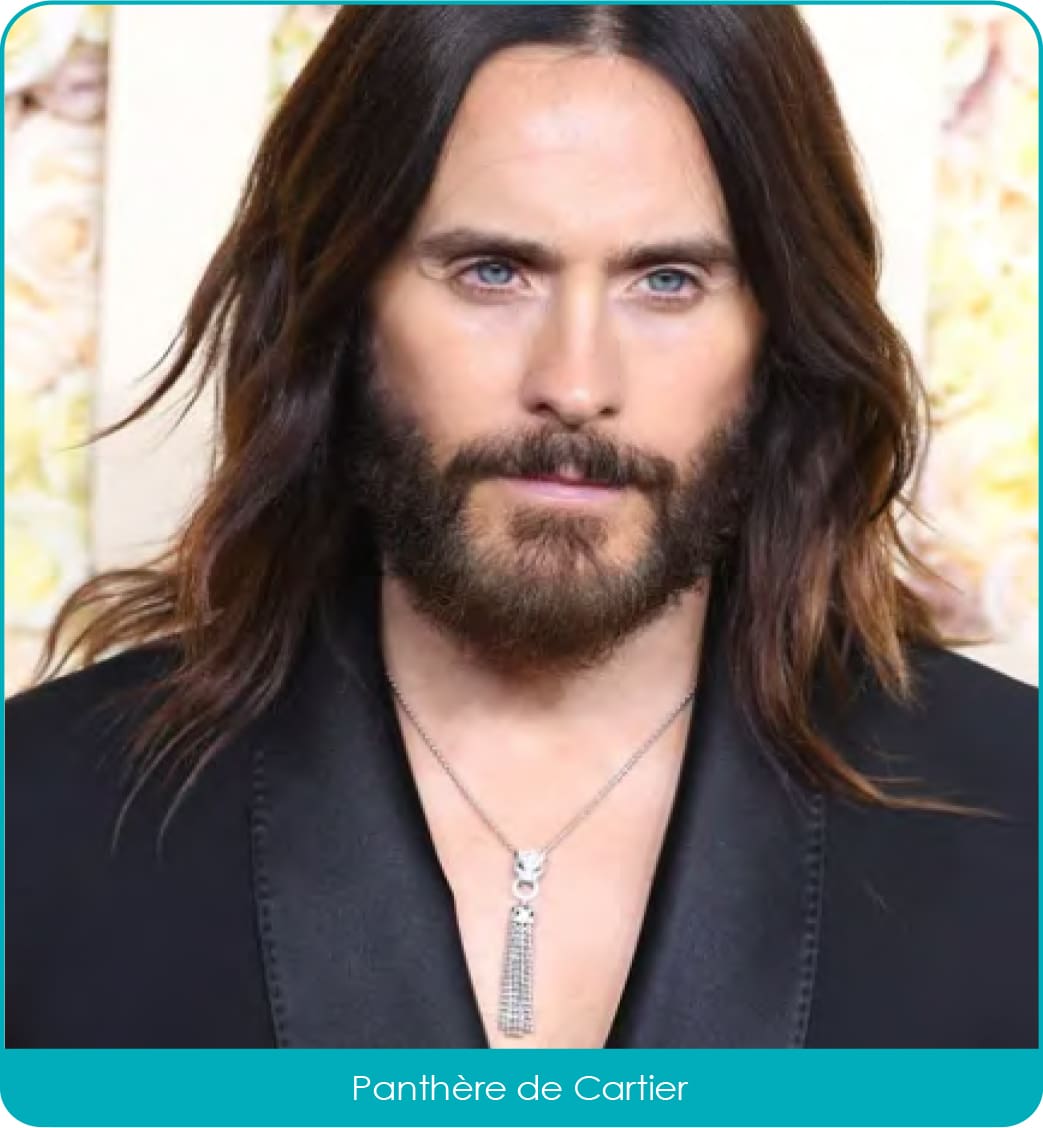 The actor Jared Leto, usually known for taking daring fashion risks, wore a simple 18 carat white gold and diamond Panthère de Cartier necklace.