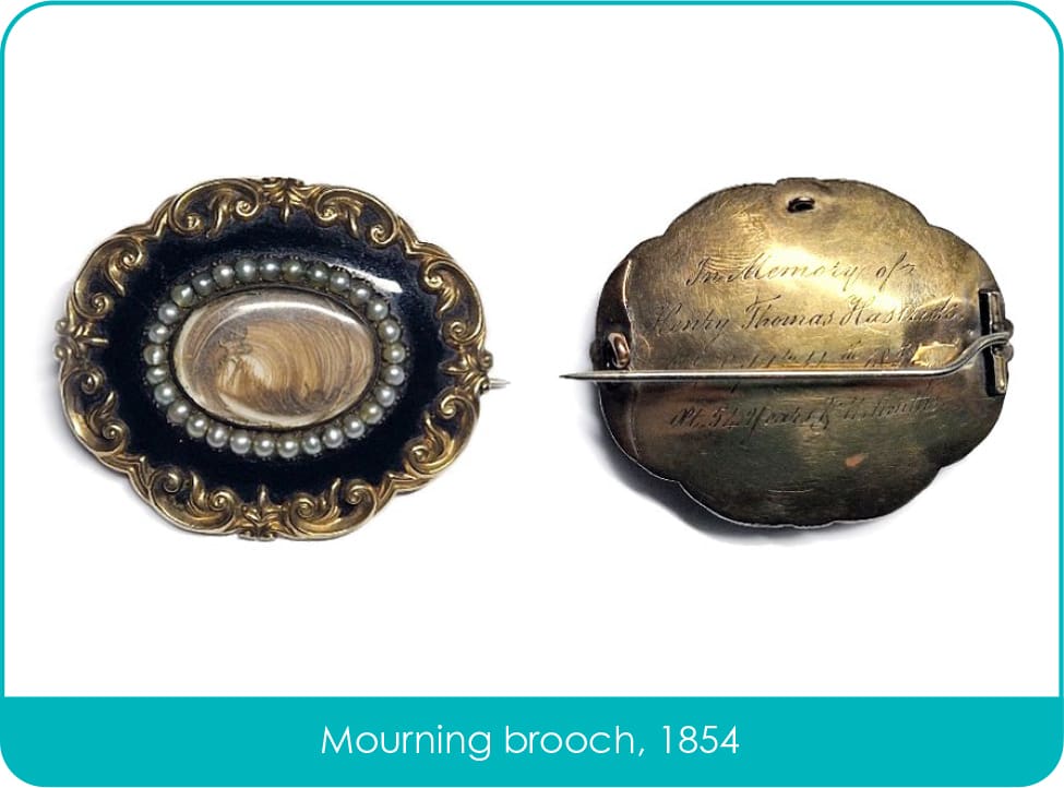 The oval onyx plaque, measuring 4cm x 4.5cm, has an overlaid border of acanthus leaf gold detail, the central glazed compartment with a lock of hair within a surround of 31 seed pearls, in closed-back setting. The reverse was engraved with ‘In Memory of Henry Thomas, Sept 14th 1854, Oct 54 years & 11 Months’.