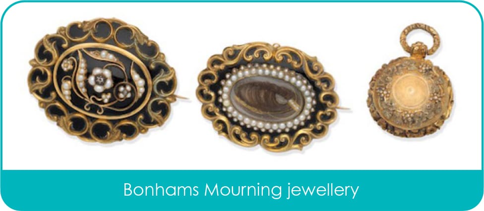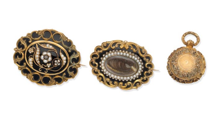 Though a very personal jewel, the demand for mourning antique jewellery is constant. The below items, comprising of two mid-19th century gold and enamel mourning brooches and an 1830s gold locket, sold at Bonhams for £1,000 (including premium).