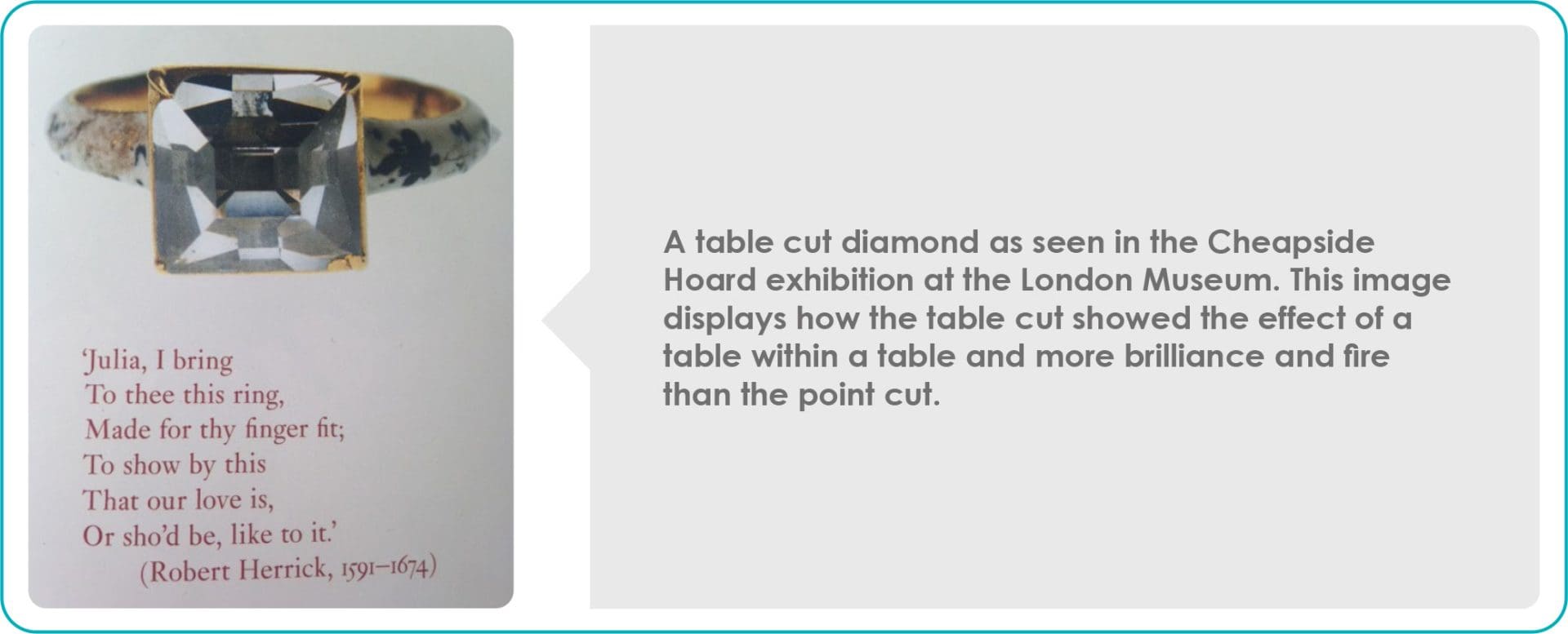 The new rough from Brazil was used to create the first old mine cut also known as the Peruzzi Cut; this has the same number of facets as the round brilliant, but with a high pavilion it resembles a cushion shape. In 1750, a London jeweller called the new style of cut a passing fad and said the classic rose cut would outlast them all.