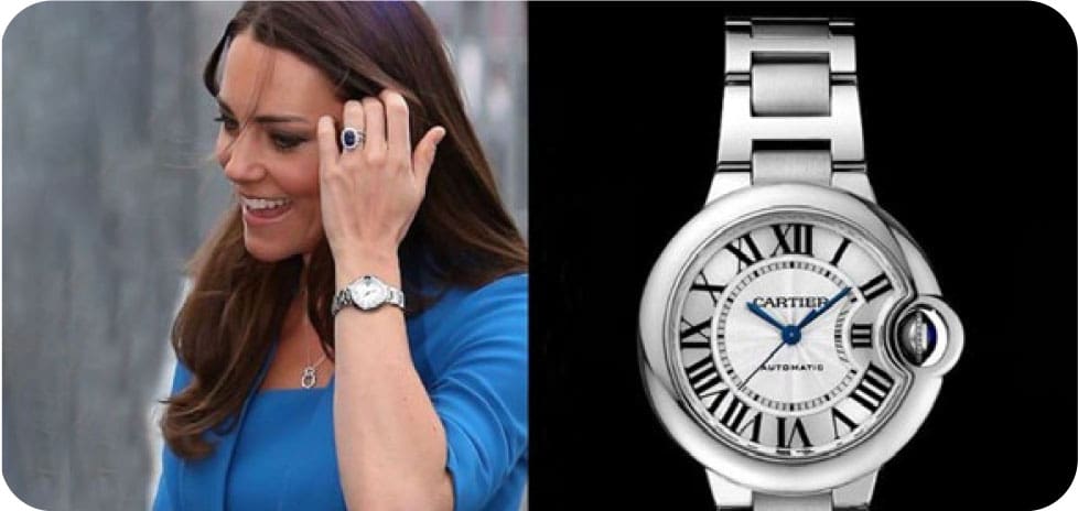 The Princess is often seen combining her engagement ring with a classic 33mm Cartier Ballon Bleu wristwatch. Mounted in stainless steel, it is decorated with Roman numerals, fluted crown with a synthetic spinel cabochon, silvered guilloché opaline dial, blued-steel sword-shaped hands, sapphire crystal and steel bracelet. It currently retails for £5,400.