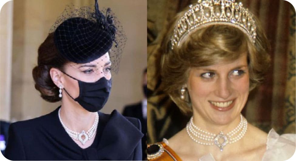 For more formal wear, the Princess has been seen wearing brooches, tiaras and exceptional necklaces, such as the four-row pearl chocker, created using a collection of cultured pearls gifted to the Queen by the Japanese government which Catherine wore to Prince Philip’s funeral in April, 2021. In mourning, the Royals don’t wear colour, so pearls are pure, white, and unflashy. This tradition comes from Queen Victoria, who did not want to wear any colour following the death of her husband Prince Albert.