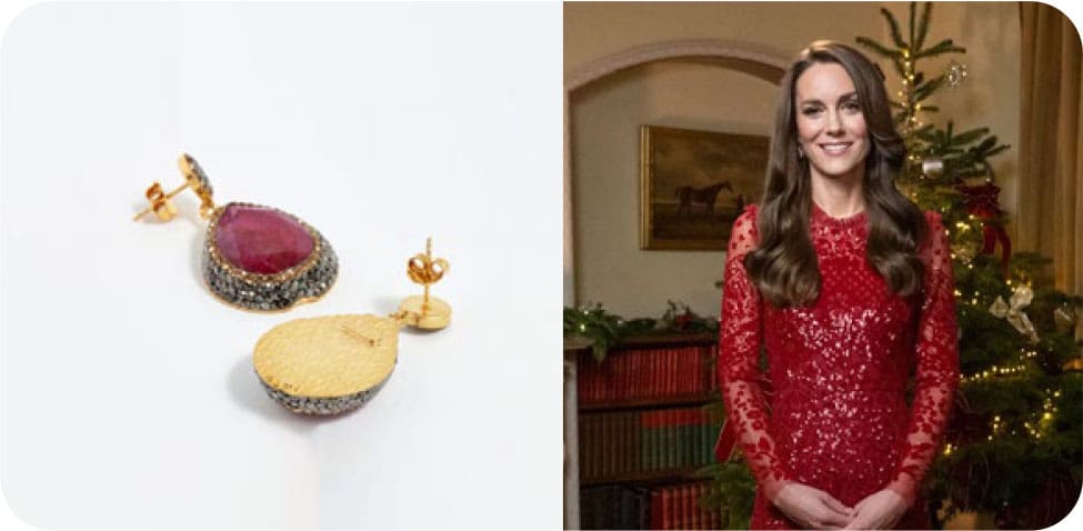 In this year’s Christmas pictures, the Princess wears a pair of ruby and diamond cluster earrings, made by Soru in Turkey, and retail for £145.
